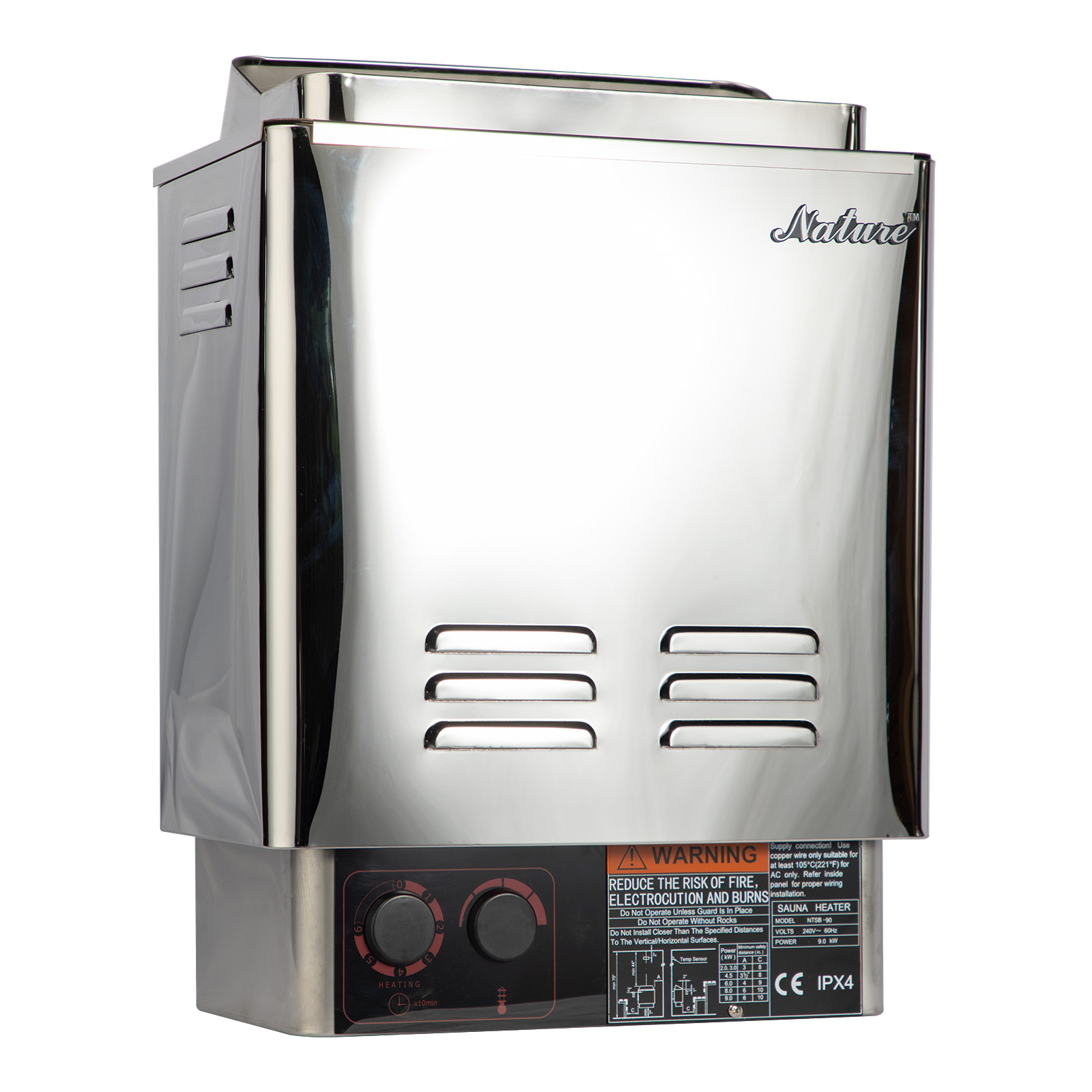 The heater can be easily installed at any spot with the adjustable wall-mount bracket.8. CE and ISO 9001:2008 certificated product. (Please check with your electrician about local requirement before purchasing ) Model SS-NTSB60 Output power 6000W (6KW) Input Voltage 240V Current 25A Required Breaker >=30A Suitable for Up to 170~320 cubic feet well-insulated sauna room with at least 7′ ceiling Controller Ā CON-6 Dimension Ā 16W x 11D x 22.5H inch (406 x 280 x 571 mm) Available Certification CE (The CE marking certifies that a product has met EU consumer safety, health or environmental requirements.) ISO9001:ISO 9001:2008 Quality management systems qualified.